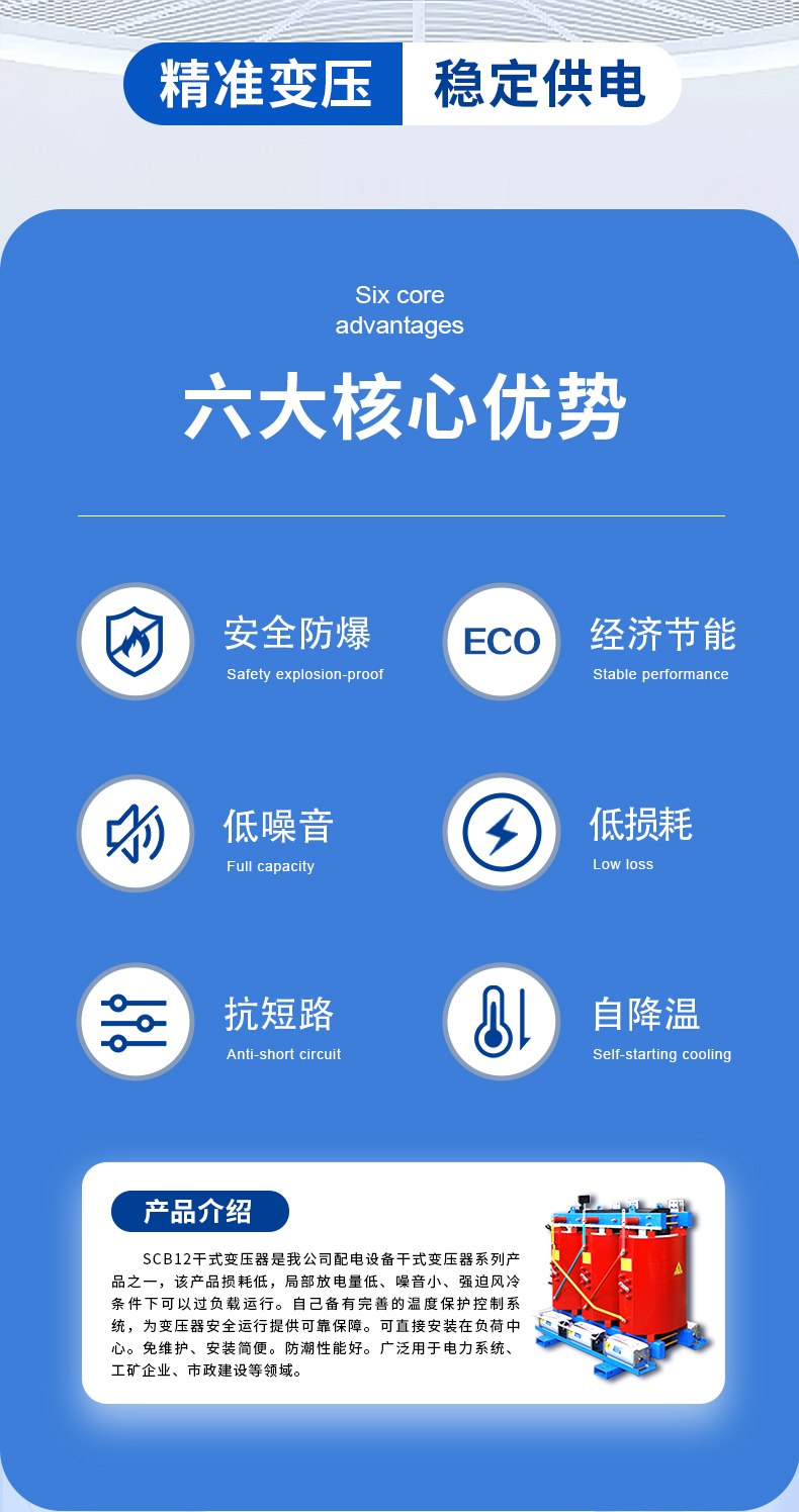 壓器、有載調(diào)壓電力變壓器、非晶合金變壓器、SC(B)10 (13)、SG(B)10(13)及SC(B)14(18)新能效系列干式變壓器、開(kāi)關(guān)柜及組合式變壓器、箱式變電站及防竊電、礦用、整流、電爐等特殊電力變壓器。產(chǎn)品廣泛用于電力、核電站、交通、礦山、冶金、建筑、石化、化工、電氣化鐵道、地鐵、城市輕軌、軍隊(duì)國(guó)防、通訊、城鄉(xiāng)電網(wǎng)建設(shè)與改造等行業(yè)的輸配電系統(tǒng),熱銷全國(guó)。