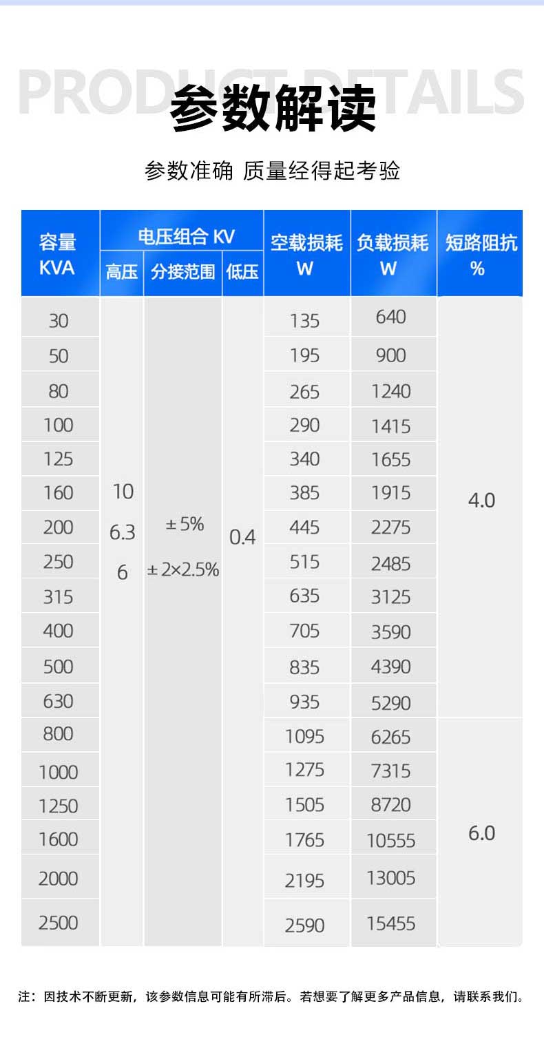 答 01全新硅鋼片噪音小,損耗低,運行穩定,壽命長02純銅線圈過載力強無氧銅線,穩定性更強,導電性能更好,抗短能力更強03浸水運行IP68防護等級,浸水運行穩定可靠04穩定可靠全密封,全絕緣的接線方式,高壓側帶熔斷保護...